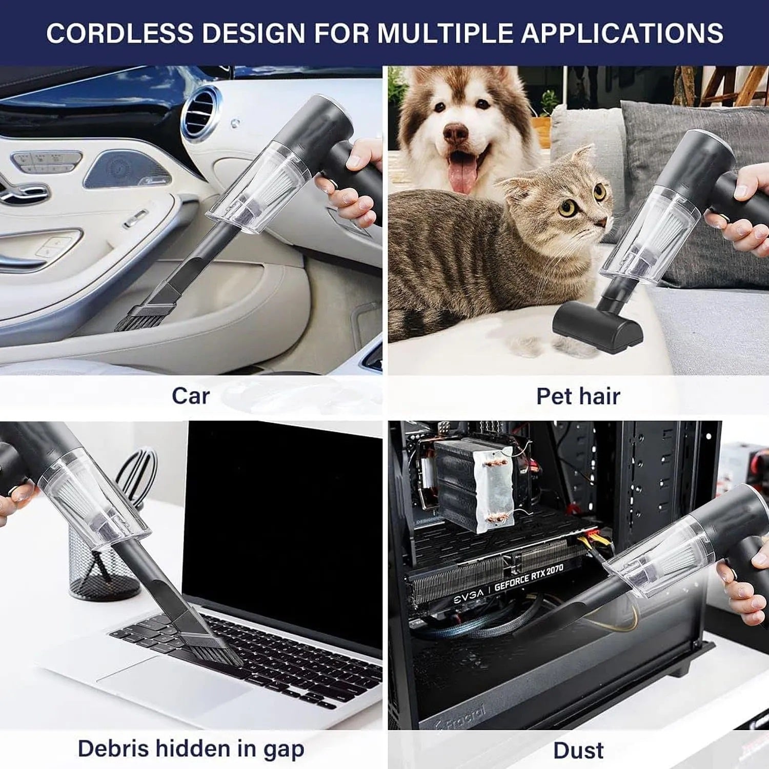 - 【Equipped with 6 Nozzles and Brushes】The Cordless Air Duster & Car Vacuum Cleaner comes with 6 different detachable nozzles and brushes are applied in different places. Perfect for cleaning dust, hair, crumbs, debris from sofa, rug, carpet, desktop, laptop, keyboard, blinds and so on, convenient to use in car, at home and office.